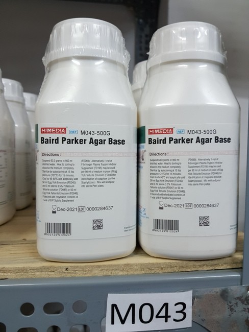 Baird Parker Agar Base. Model: M043 (Himedia Ấn Độ).Xuất hiện ở dạng kem màu vàng đồng. Được khuyến nghị phân lập và liệt kê staphylococci coagulase dương tính từ thực phẩm và mẫu lâm sàng. Quy cách đóng gói: Lọ nhựa 500g