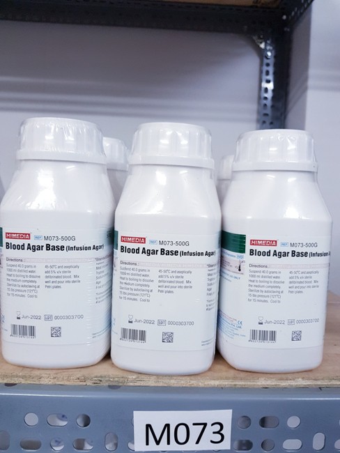 Blood Agar Base (Infusion Agar). Code: M073 (Himedia- Ấn Độ). Xuất hiện ở dạng kem màu vàng đồng. Được sử dụng để làm cơ sở bổ sung trong phân lập và nuôi cấy các vi sinh vật gây bệnh khó tính như Neisseria, Streptococci, v.v. Quy cách đóng gói: Lọ nhựa 500g