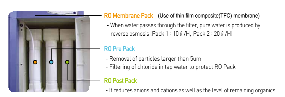 – Sử dụng 3 lõi lọc: Cột tiền lọc, Cột lọc thẩm thấu ngược (RO) và Cột trao đổi Ion.