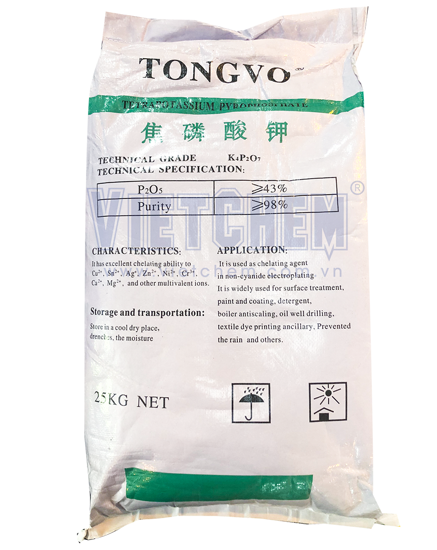 Tetrapotassium pyrophosphate hay còn được gọi là Potassium pyrophosphate, Kali pyrophotphat là hợp chất vô cơ có công thức hóa học là K4P2O7, có ngoại quan dạng bột màu trắng tan nhanh trong nước, không tan trong ethanol, có khả năng hút ẩm mạnh, ổn định trong các môi trường khác nhau…